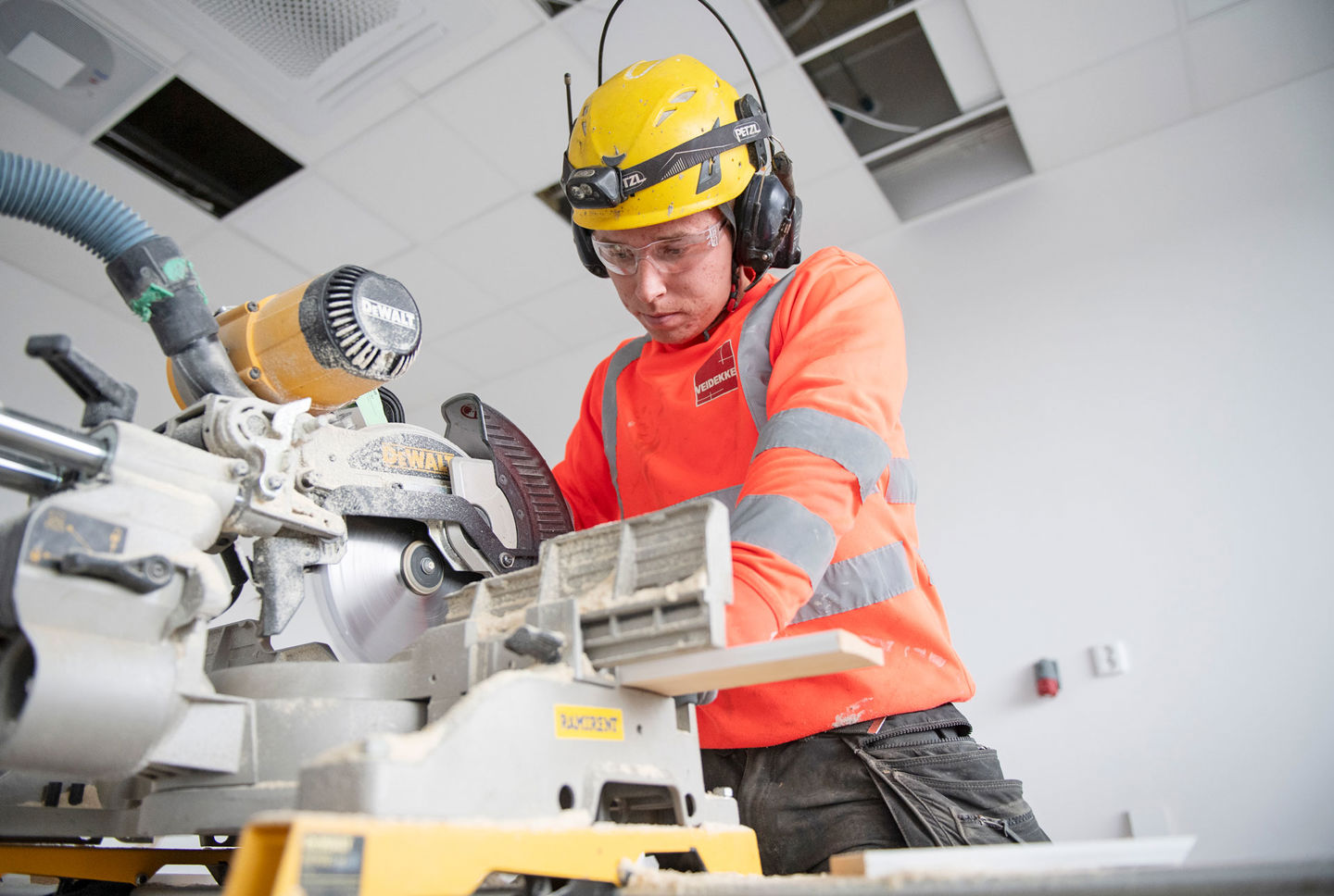 Efter en period som trälärling, har Sebastian Hedstigen fått sitt efterlängtade yrkesbevis som träarbetare. Nu är han anställd som snickare på Veidekke Bygg Syd, där han arbetar inom olika industriprojekt.