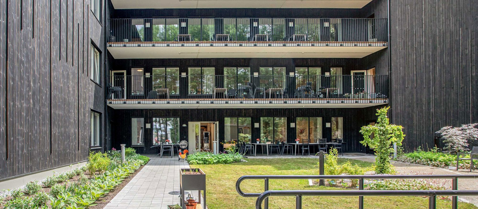 Med sina 4 500 kvm ligger boendet försiktigt placerat i en skogsglänta. Den japaninfluerade utformningen med träfasad och sedumtak gör att det smälter in i omgivningen, nära Stockholms inlopp och ett känt spa. För arkitekturen står Reflex Arkitekter.