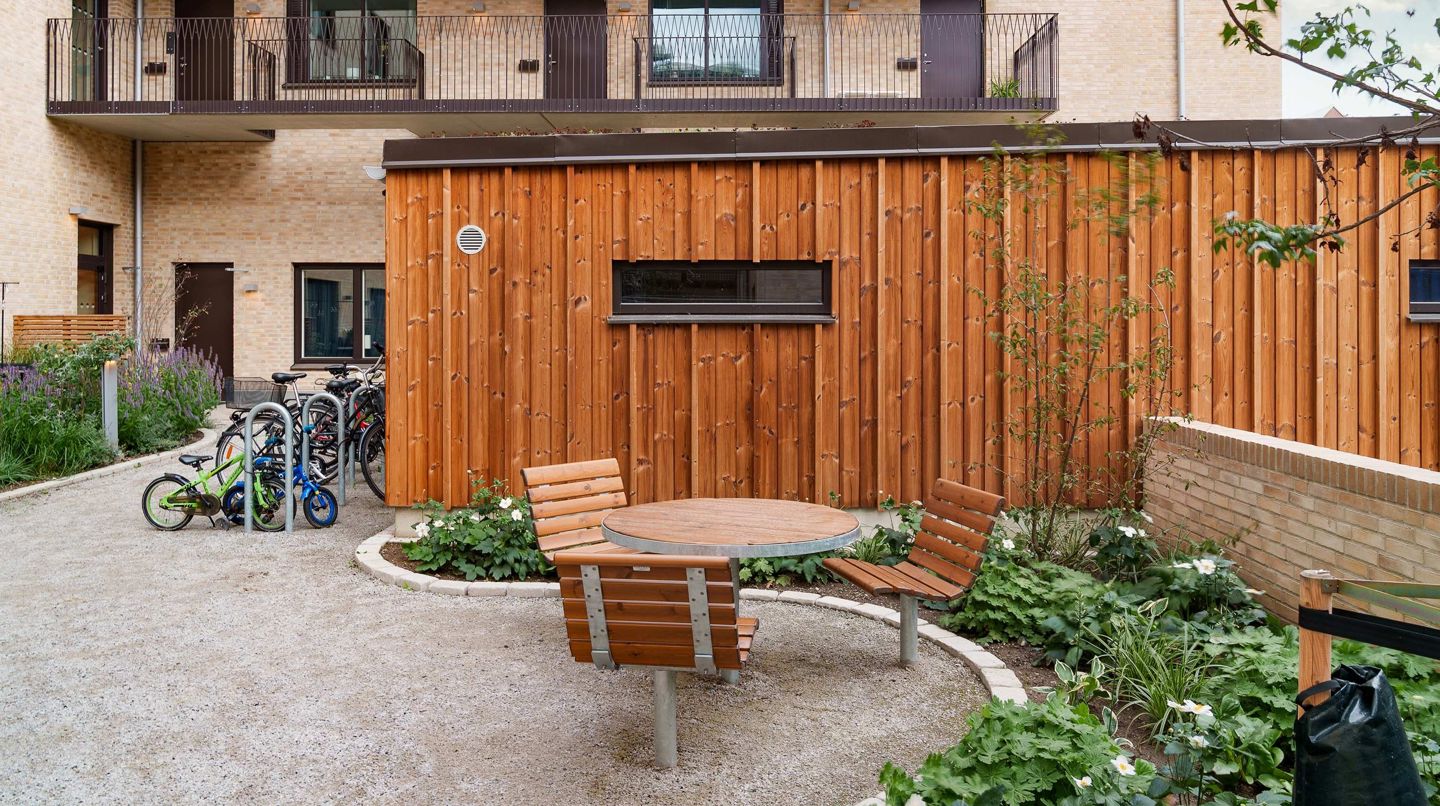 Byggnaden har en trivsam innergård och en fasad av återvunnet tegel.
